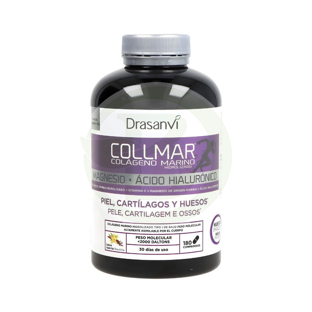 Collmar 180 comprimidos de Drasanvi. El Colágeno utilizado ha sido expuesto a un proceso único consiguiendo que se rompa en lugares concretos para facilitar su mejor absorción, enriquecido con ácido hialurónico, con Vitamina C y aportando un 66% de magnesio, esencial para distintas funciones, ayudando a mantener los huesos y músculos.